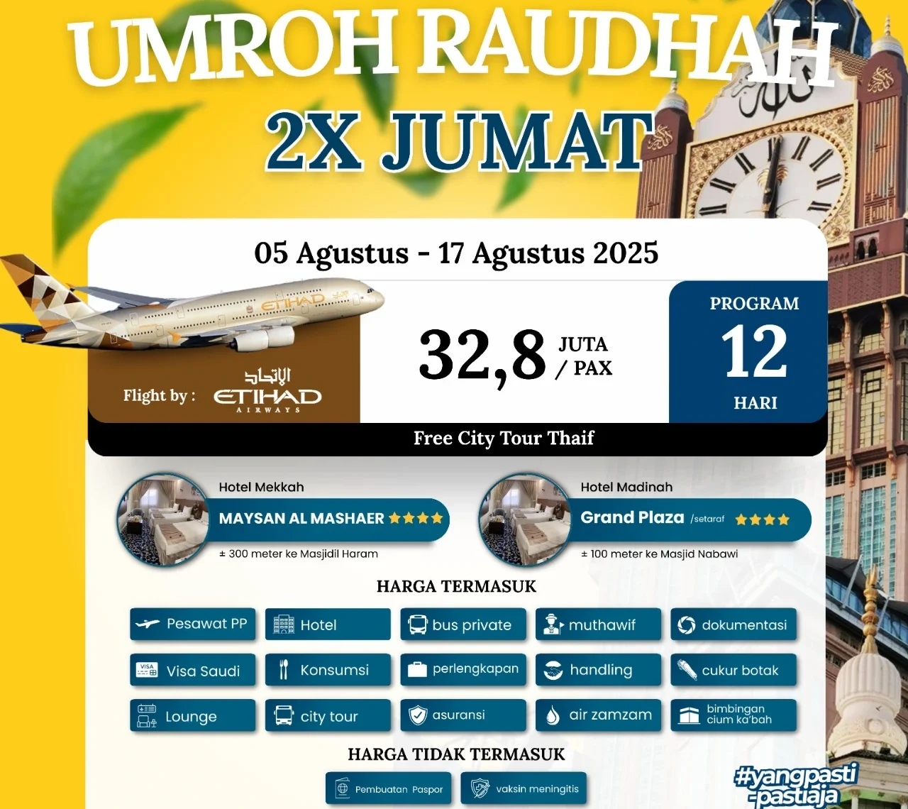 Paket umroh RAUDHAH merupakan program umroh dengan fasilitas bintang 4. Program ini berdurasi 12 hari dengan kesempatan merasakan sholat jumat di 2 Masjid Mulia, Masjidil Haram dan Masjid Nabawi. Paket umroh ini merupakan salah satu program dengan fasilitas yang lengkap. Dengan jarak hotel hanya 400 m dari pelataran masjid, program ini cocok untuk setiap kalangan.